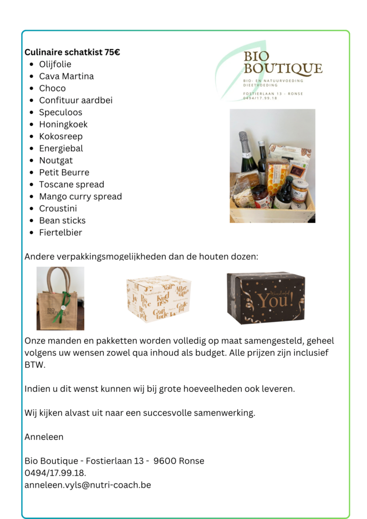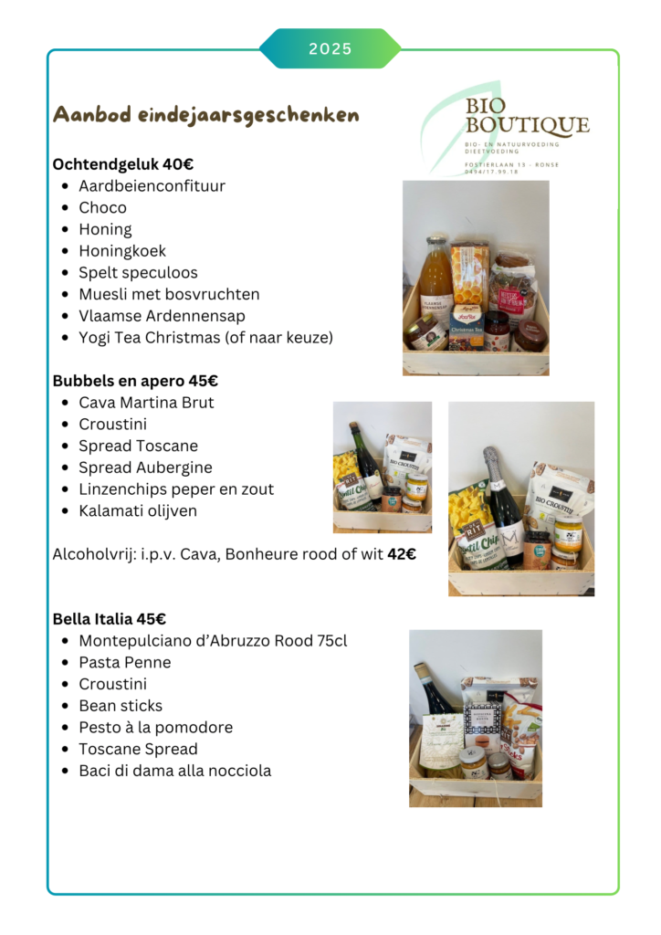 Eindejaarsgeschenken / Relatiegeschenken / cadeaumanden Voorstel eindejaarsgeschenken Bio Boutique – Ronse Kerst 2025